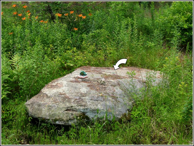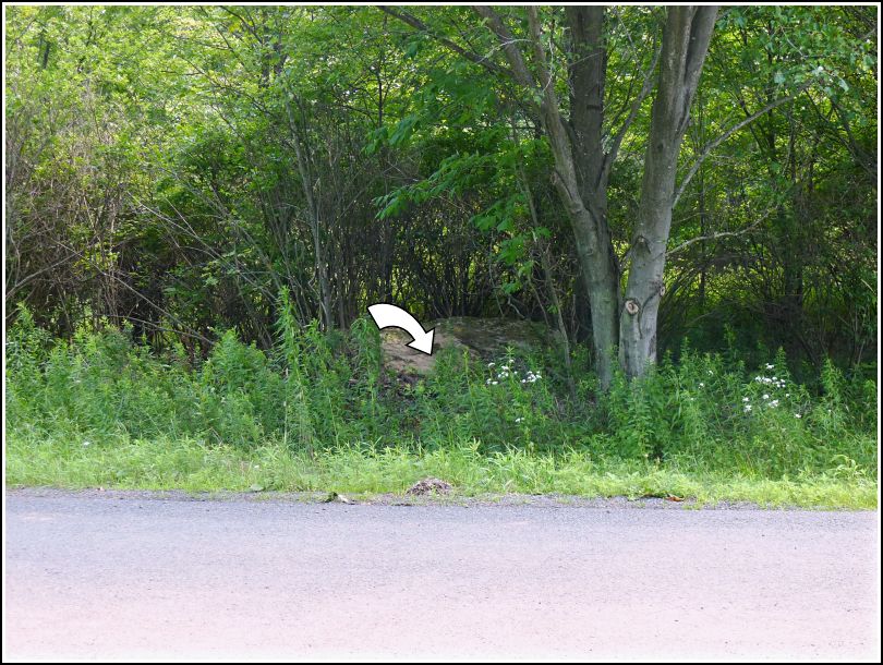 Rich parked at the intersection of T 435 (Layton Road) and Tuthill Road. As soon as I walked a few yards northeast along Tuthill Road, I could see a large rock outcrop east of the road, just inside the tree line. Unwilling to wade through the weeds, which most certainly contained poison ivy (of course), I scouted the rock outcrop with the help of binoculars. I still couldn’t see a disk, but with no other outcrops anywhere nearby, I was sure this was the correct one. I took a chance and picked my way delicately through the weedy border (which did contain a small amount of P.I., but a much larger quantity of dewberry). I was soon standing right over the mark. It was well camouflaged, but easily spotted from just a few feet away.