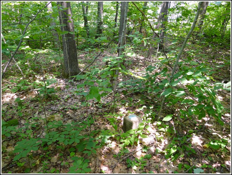 Our third mark for today, TT 19 T, took us on a winding country road adventure. The panoramic views of the windmills from Robinson Road were a real treat! Much of the description is long out of date, but we trusted that the coordinates I’d pulled from the topo map would get us within twenty feet of the mark, as they typically do. We drew close to the coordinates and found ourselves nearing the base of a gravel driveway, with a wooded patch to the north. We drove by slowly, not expecting to see much from the road. But in an instant, we both spotted a yellow-painted post several yards into the woods!