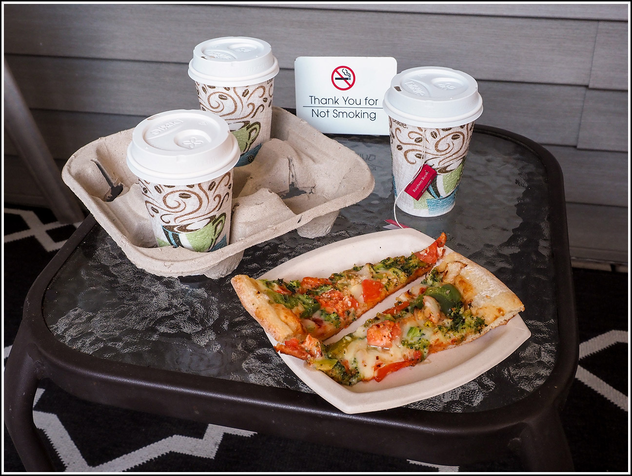 Today started out a little slowly, but we were up and moving around by 7:00 and were so happy to have a slice of Rosalie’s pizza to share for breakfast. We complemented it with tea, coffee, and orange juice from the motel lobby. The pizza reheated just fine in the microwave; although it was a little “floppy,” it still tasted great.