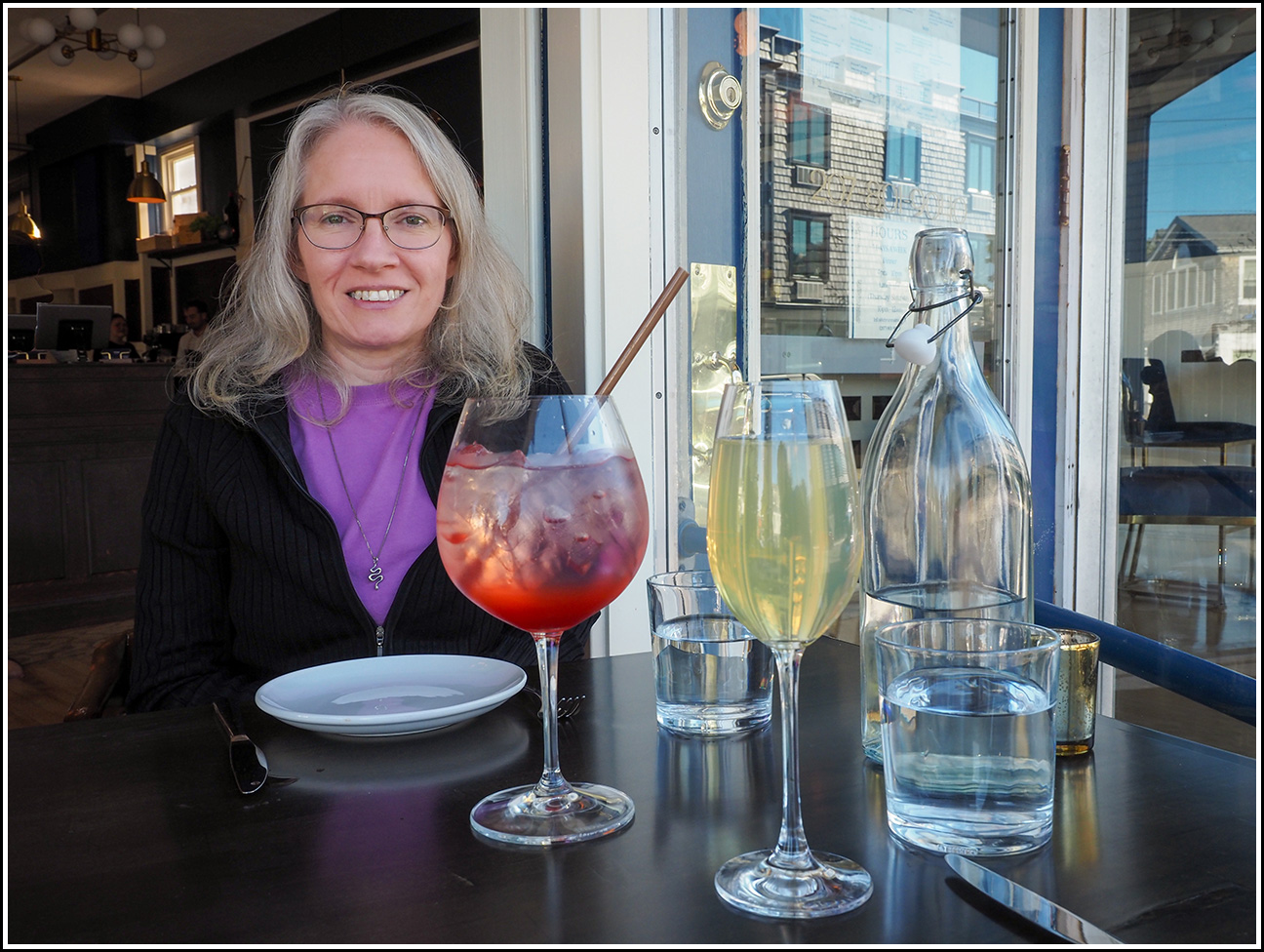Our dinner at Brasserie Le Brun (where, I just realized, we went on the first Sunday of last year’s trip, too) was the most relaxing part of the day by far. We started out with some badly-needed and very intriguing cocktails: Death in the Afternoon (absinthe and champagne) for Rich and Center of Attention (gin and tonic with blackberry) for me. We had no idea what to expect from the absinthe, and to be honest I was very surprised that Rich ordered it. But we were both thrilled with it! My first thought was that it smelled and tasted like Good & Plenty candy (not a bad thing, if you like black licorice, which I do) but not as sweet. As we sipped it, we noticed other interesting herbal notes. The gin & tonic was also intriguing and refreshing, and Rich commented that it would be very easy to drink a few without realizing the effect it was having, and then be unable to stand up afterward.