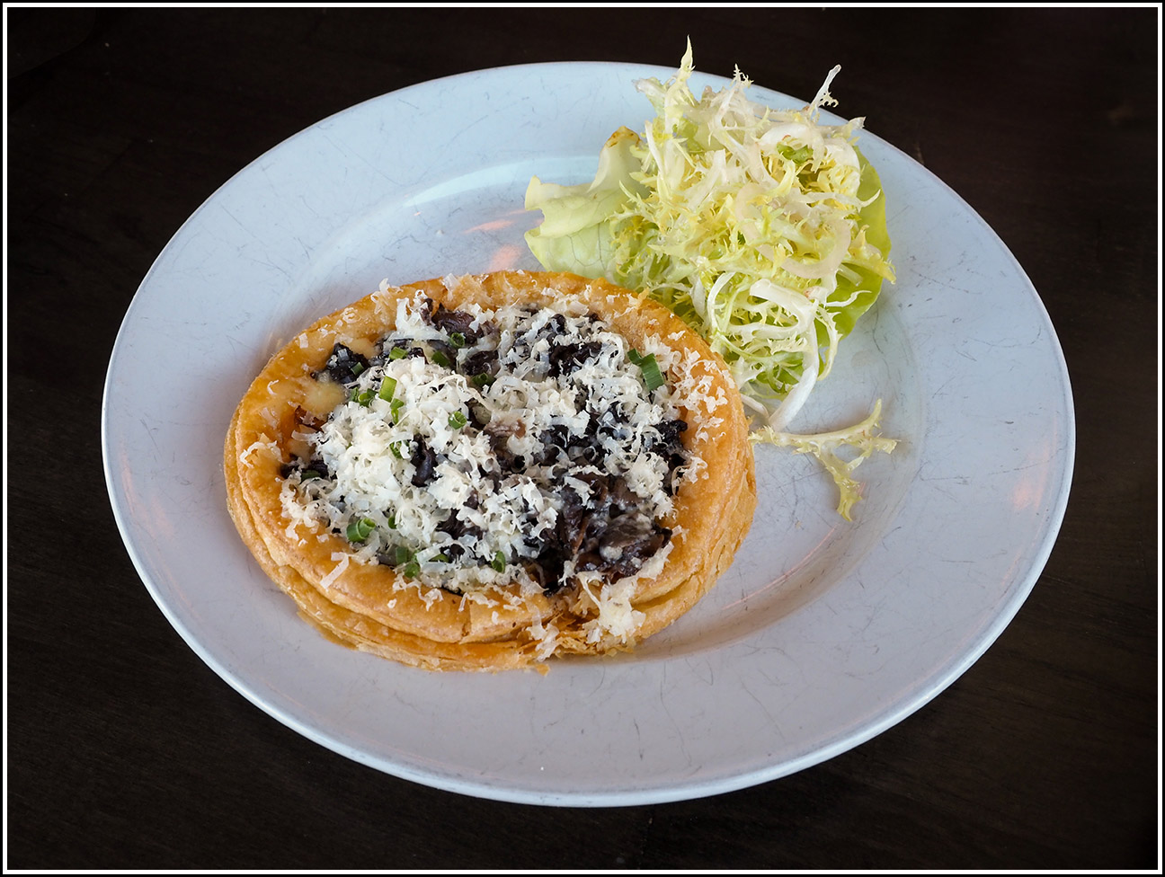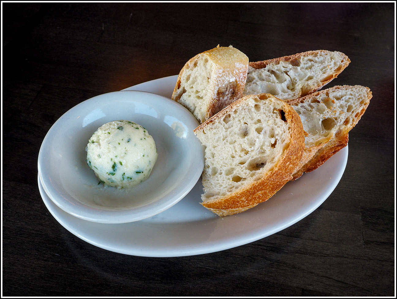 While we were trying the drinks, some warm crusty bread came out, served with a delicious chive butter. I would like to make something similar at home to serve with my homemade bread! And next was our appetizer, an equally delicious wild mushroom “tart” with a puff pastry crust.