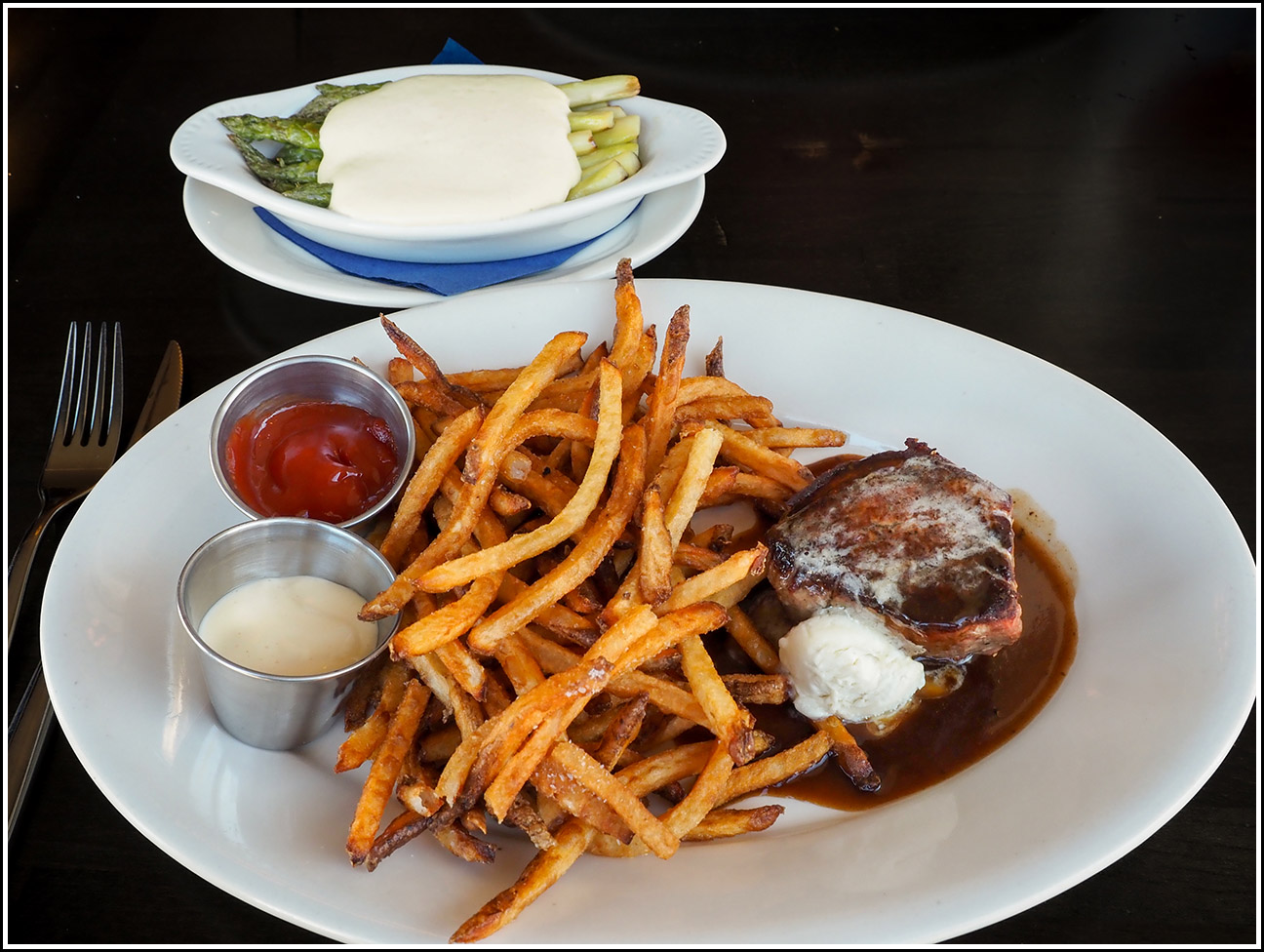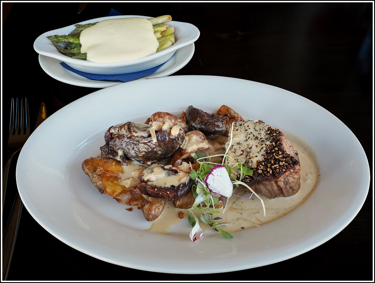 Our entrees were something we’ve been looking forward to all year: filet mignon, but two different ways. Rich chose the steak frites, and I had the au poivre. Apparently they are doing something new at Le Brun this year, and offering those two meals with a choice of five or six different cuts of meat. It was everything we were hoping for! The meat was as tender as ever, and the frites were perfectly thin and crispy, and it came with the malt vinegar aioli that I enjoyed so much last year. My filet au poivre was amazing as well. The multicolored fingerling potatoes that came with it were perfectly textured and seasoned, and we both thought the sherry cream sauce was amazing. We also got a side order of asparagus, lightly grilled and topped with bearnaise sauce.